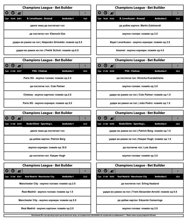 Лигата на шампионите продолжува со нови четири осминафинални дуели, за кои во Sport Life има подготвено Бет билдери. Десет различни опции, има голем избор, а треба да се одбере добитната.