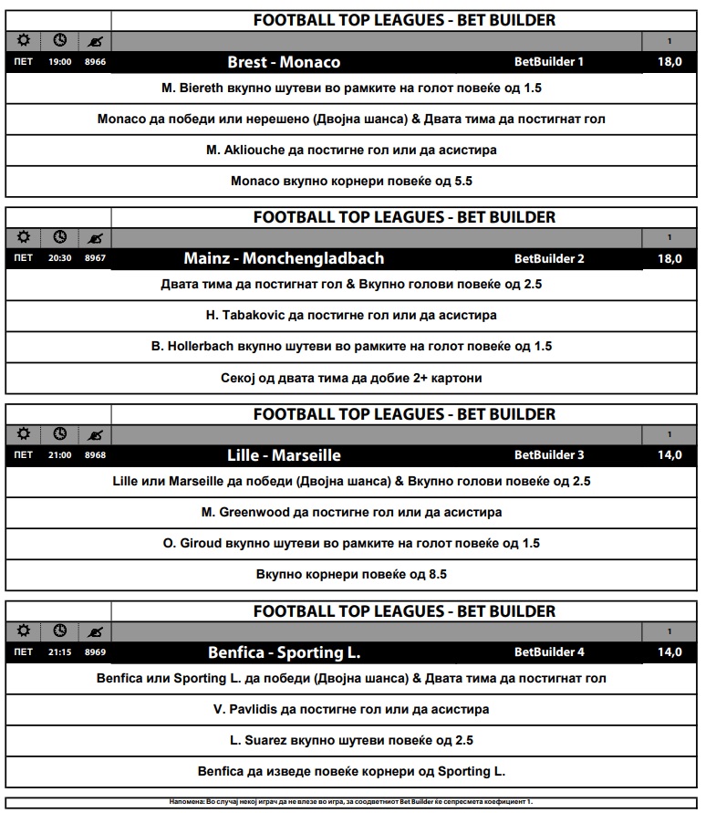 Подготвена е Бет билдер понудата и за овој петок. Најинтересните натпревари се дополнително покриени и со предлози со големи квоти.