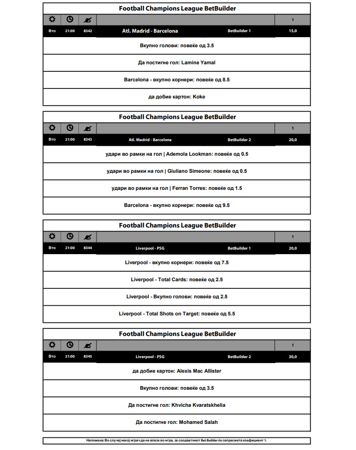 Подготвена е и Бет билдер понуда за натпреварите Атлетико Мадрид – Барселона и Ливерпул – ПСЖ.