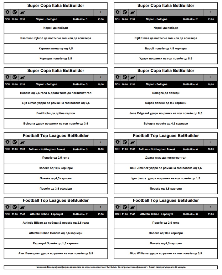 Наполи и Болоња ќе се борат за трофејот во Суперкупот на Италија и можете да одберете дури четири предлози за овој меч, а најголемата квота се нуди за пресметката во Лондон меѓу Фулам и Нотингам форест во Премиер лигата.