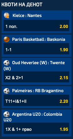 Три фудбалски натпревари и по еден ракометен и кошаркарски се дел од понудата во Квотите на денот во Sport Life. Вкупната квота на петте предлози е 35.00, додека поединечно квотите се движат помеѓу 1.90 и 2.20.