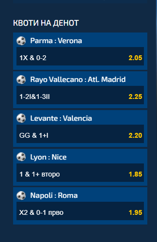 Петорката ја заокружува квота од 1.95 и тоа варијантата Наполи да не ја совлада Рома и притоа во прво полувреме да не падне повеќе од еден гол.