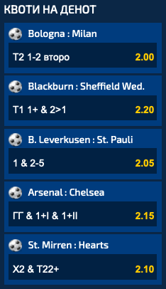 Понудената квота од 2.15 за дуелот на Арсенал и Челзи ќе биде добитна само ако се затресат двете мрежи во Лондон, но и ако има најмалку по еден гол и во двете полувремиња.