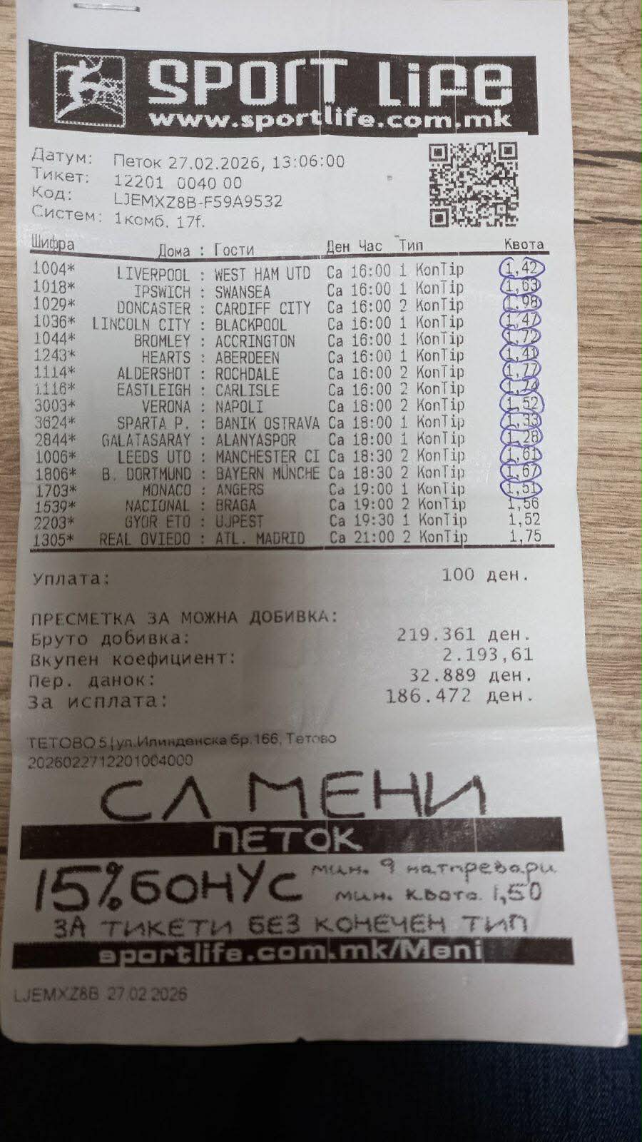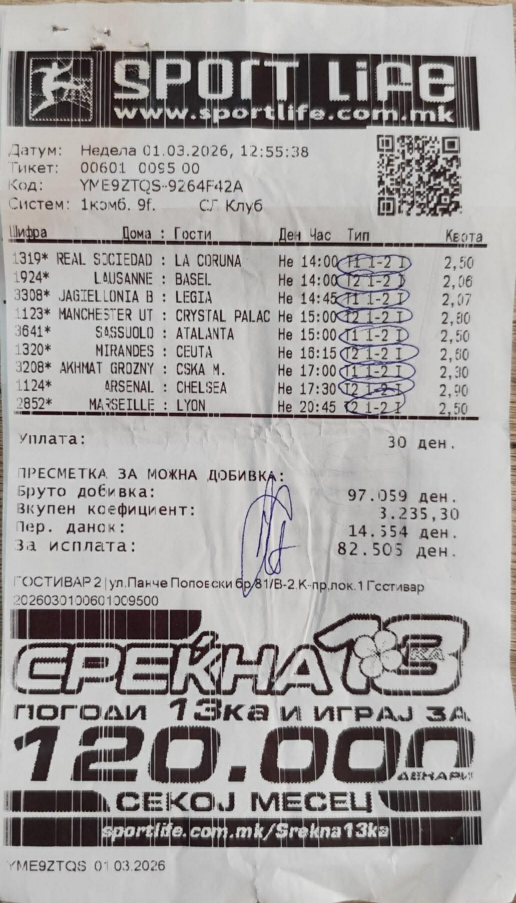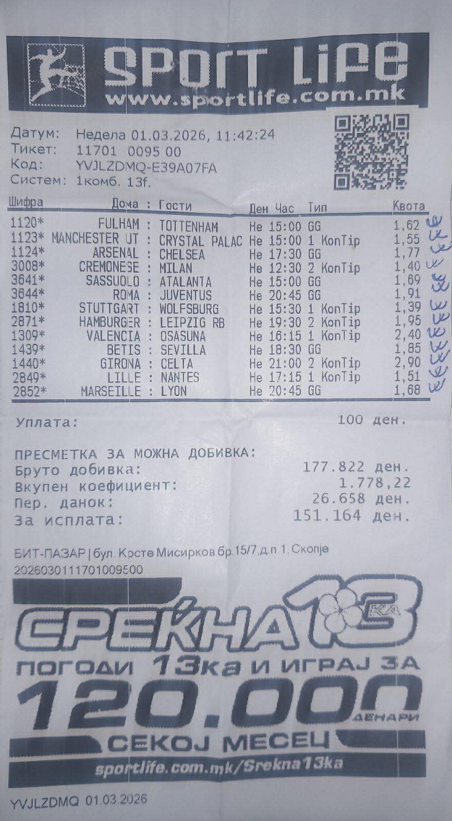 Бројот 13 му беше среќен, погоди 13 меча, комбинација од конечен тип и „гол-гол“, а уплатил 100 денари.