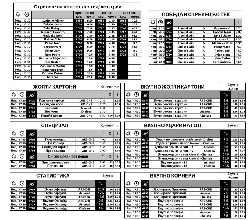 Во понудата за стрелци, најголеми шанси да погоди им се даваат на фудбалери на Топчиите, а во прв ред тоа се Ѓокереш, Габриел Жезус, Сака, Тросар, Езе. Од Челзи, најголема опасност по голот на Арсенал се очекува да бидат Палмер и Жоао Педро.
