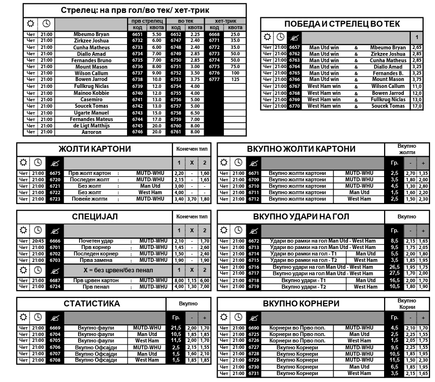 Во Специјалот на Sport Life за премиерлигашкиот дуел на Манчестер јунајтед и Вест хем има многу привлечни игри, а вистински предизвик е да се погоди кој ќе биде прв стрелец. Секако, тука е и опцијата да одиграте на стрелец кога било во текот на средбата, има доста играчи од Манчестер, треба само да погодите кој ќе биде.