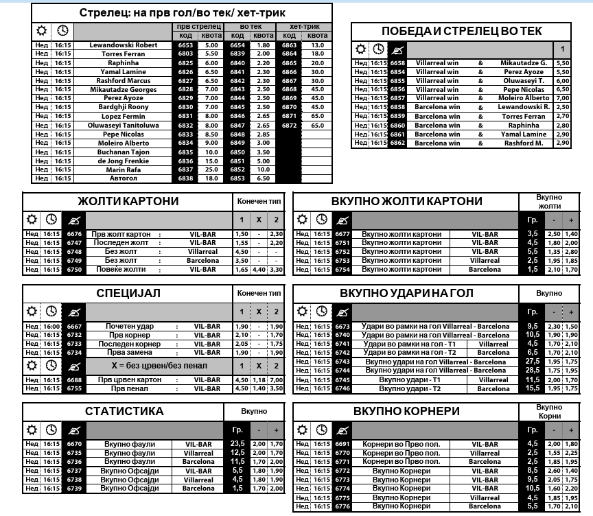 Може да се обложите и на кој тим ќе има почетен удар, прва замена, повеќе корнери, картони, офсајди, фаули, шутеви во рамки на гол, дали ќе има пенал, црвен картон, автогол.