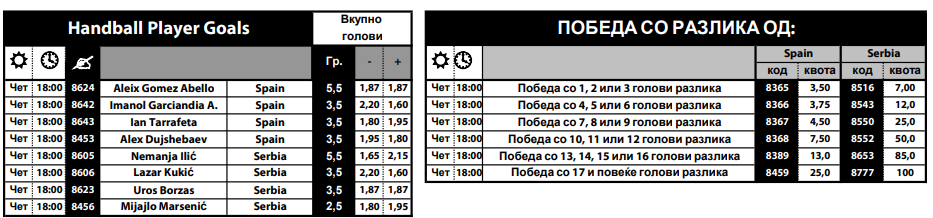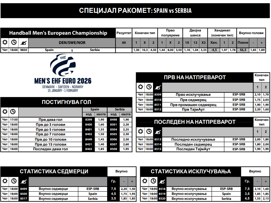 Отворањето на континенталниот собир е со мечот меѓу Шпанија и Србија. Овие две селекции одлично се познаваат меѓу себе и во последните две години одиграа петпати. Шпанија има три победи, а Србија се радуваше двапати. На четири од тие пет меча било неизвесно и на крајот разликата била меѓу два и четири гола, што значи дека може да се очекува интересен дуел. Затоа тука се и комбинациите за победник и колку разлика ќе биде на крајот.