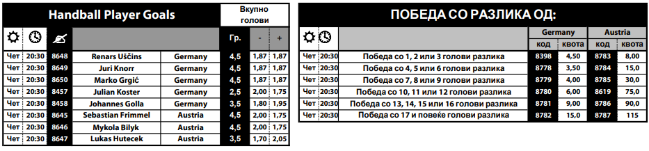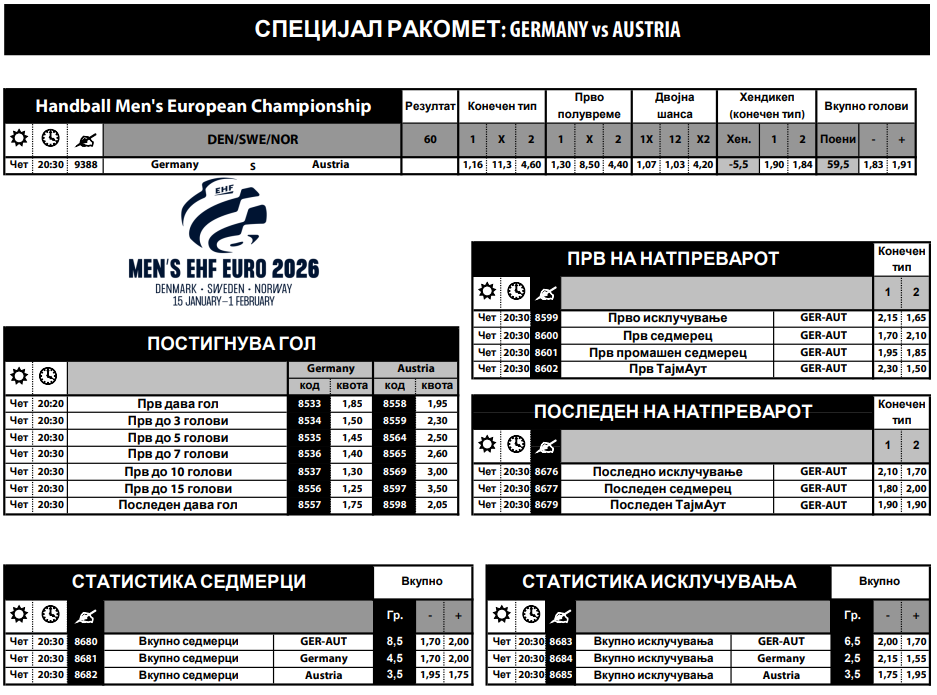 Во соседското дерби Германија е голем фаворит за триумф против Австрија. Германците секако се меѓу фаворитите и за највисок пласман. Австрија загуби на сите четири подготвителни меча што ги имаше пред почетокот на ЕП, и тоа од Унгарија, Чешка, Франција и Словенија, па ќе биде чудо ако изненади против Германија.
