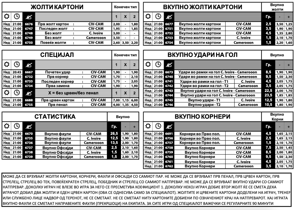 Брегот на Слоновата Коска и Камерун во меѓусебен дуел ќе одлучуваат за првото место во групата на Африканскиот куп на нации. „Слоновите“ ја имаат фаворитската улога според квотите во Sport Life, па за нивна победа ќе добиете квота од 2.15, додека квотата за триумф на Камерун е 3.80.