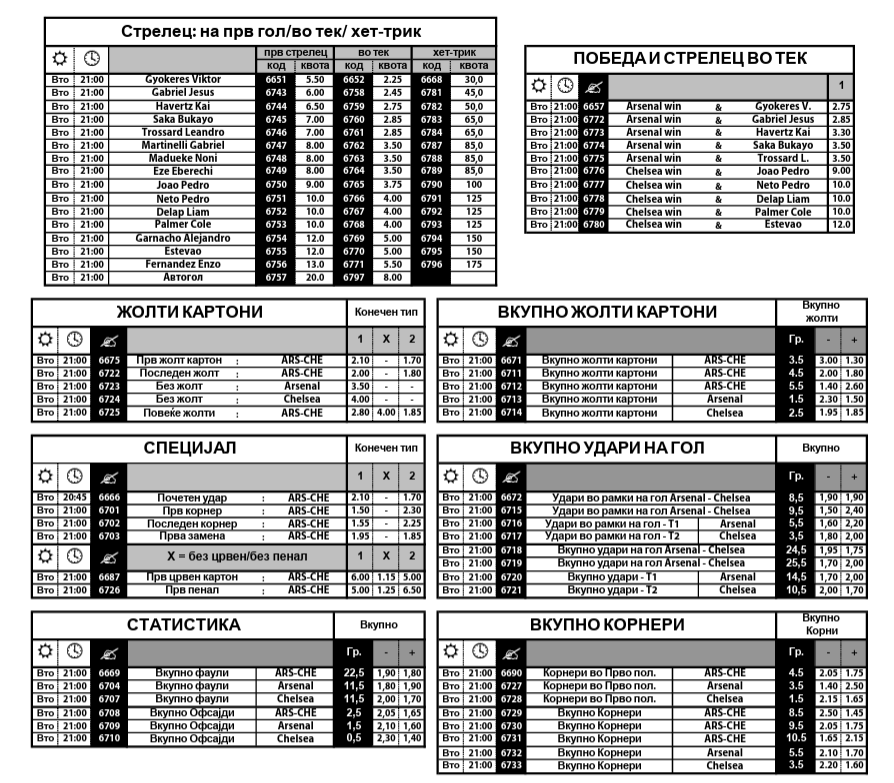 Во двата тима ќе фали по еден важен играч, Мерино кај Арсенал и Естевао кај Челзи. Инаку Челзи од август 2021 наваму нема победа над Арсенал, па и затоа домашните се фаворити.