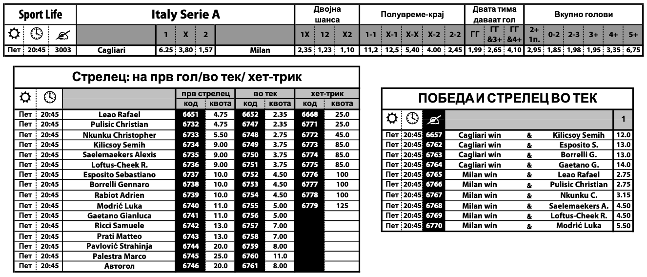 За мечот помеѓу Каљари и Милан има и две опции за Бет билдерот, кои имаат квоти од 19.00 и 24.00. Комплетната понуда на Sport Life може да ја најдете на следниов ЛИНК.