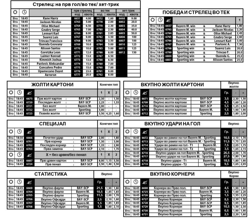 Баерн Минхен – Спортинг Лисабон и Интер – Ливерпул се натпреварите од Лигата на шампионите за кои Sport Life подготви Специјали со широка лепеза на игри на кои може да се обложите и да чекате добивка.