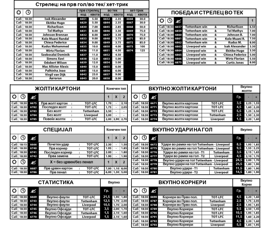 Како и секогаш, поголеми се квотите прв гол да даде тим кој не е фаворит за победа, како и квотите за број на фаули, пенал, корнери, веројатноста за црвен картон.