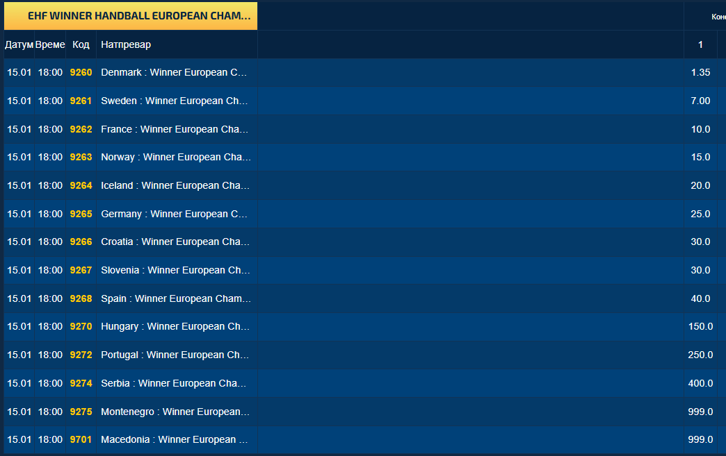 Што се однесува до квотите за првак, и тука Данска е прв фаворит, но потоа следуваат Шведска, па Франција, Норвешка и Исланд, а Португалија е 11-то рангирана.