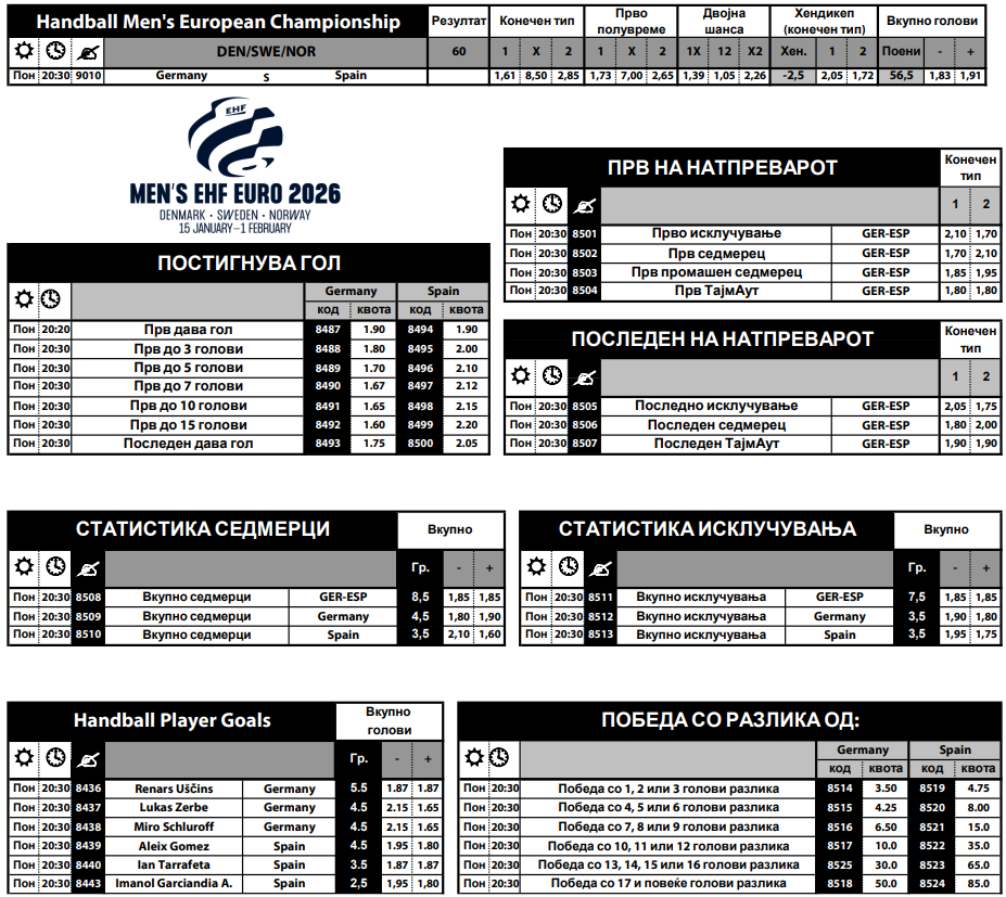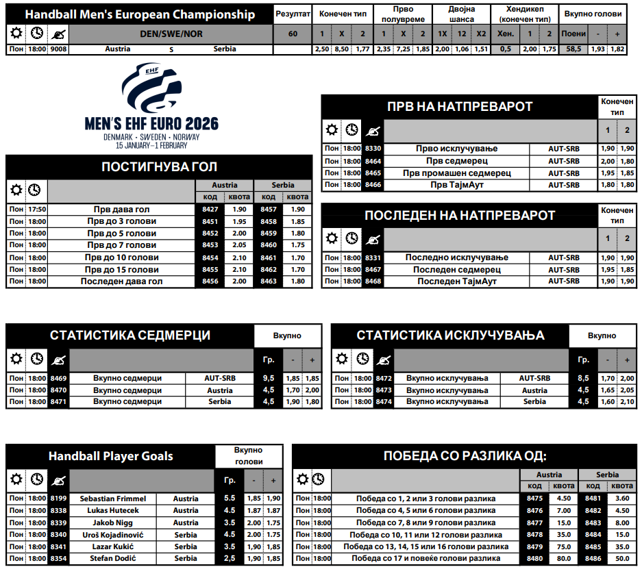 Србија да победи со 4, 5 или 6 гола е со квота од 4.50, а да влезе Србија во ритам и да забележи двоцифрена победа е со квота од дури 15.