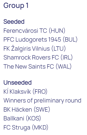 Денеска во Нион е ждрепката и сите четири екипи ќе ги дознаат првите противници. Струга е во улога на неносител во Група 1 и за противник ќе добие една од следниве екипи: Ференцварош (Унгарија), Лудогорец (Бугарија), Жалгирис (Литванија), Шемрок (Реп. Ирска) и ТНС (Велс).