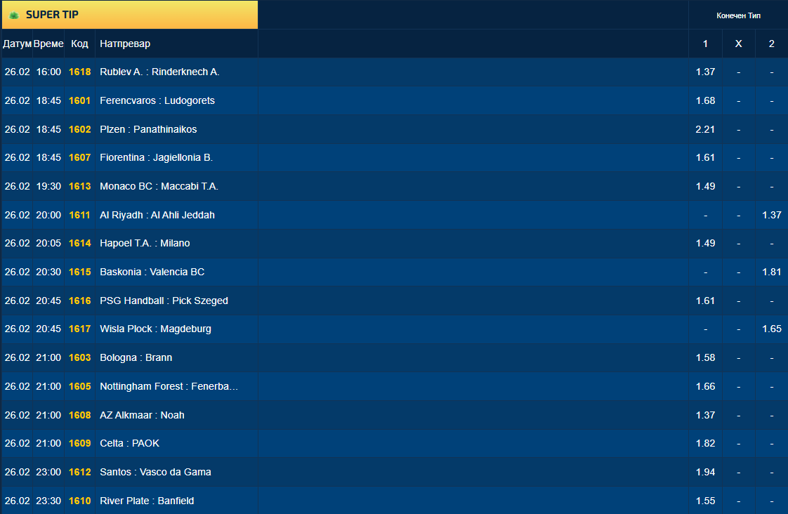 Можете да бирате меѓу бројните фудбалски џокери (по пет предлози за секој меч посебно), а тука се и супер квоите за победа на фаворитите во дуели од елитен тенис, кошарка и ракомет.
