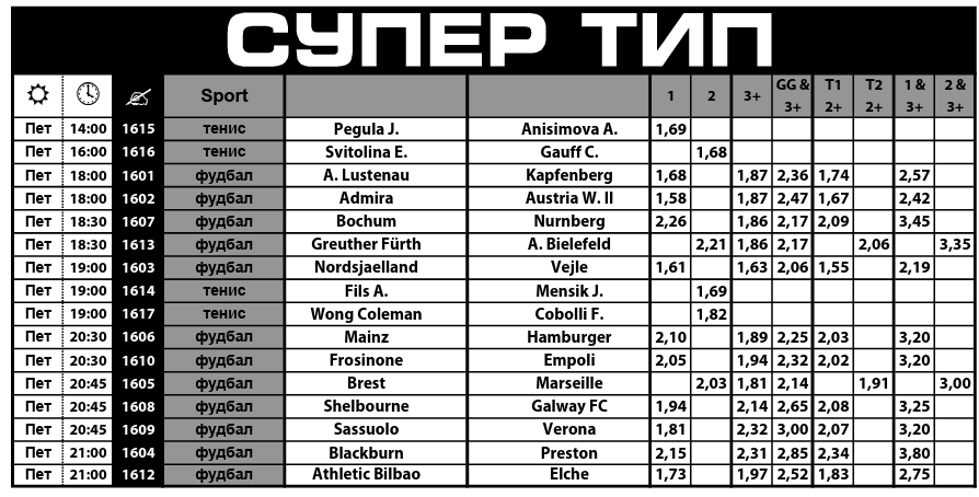 Фудбалски и тениски натпревари се најдоа во денешната Супер тип понуда на Sport Life. Има доста интересни мечеви со привлечни квоти за победи на фаворитите, како кај тенисот така и кај фудбалите.