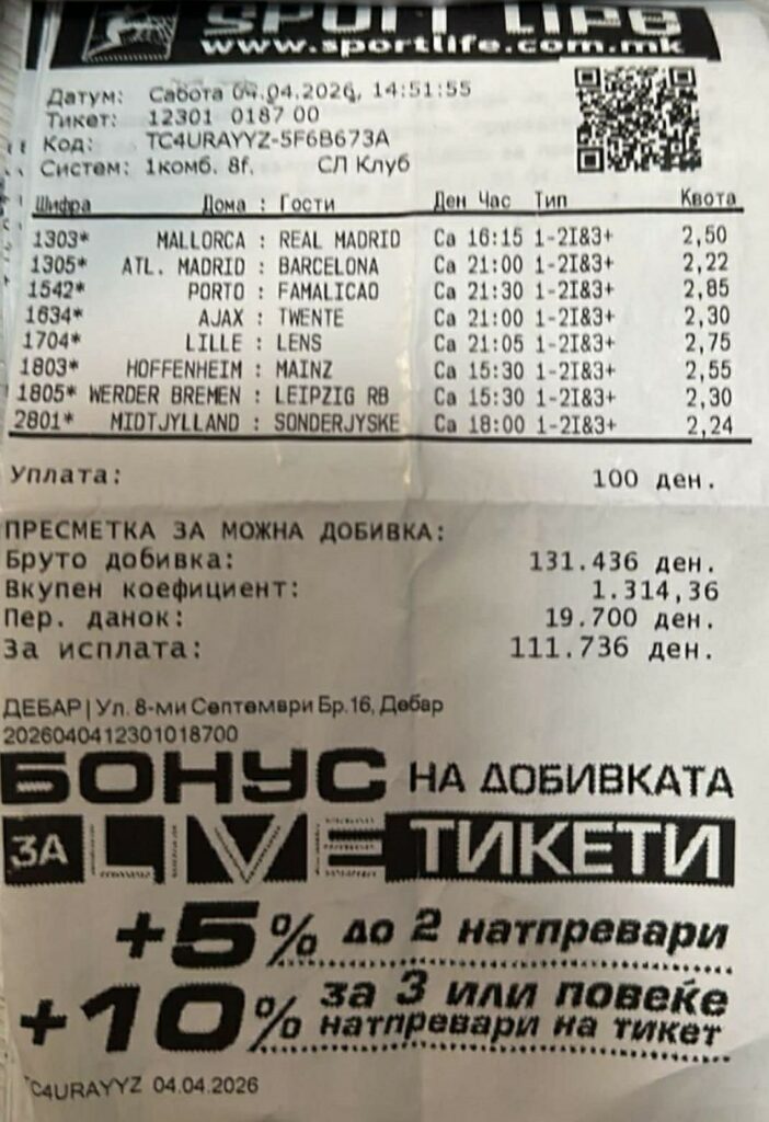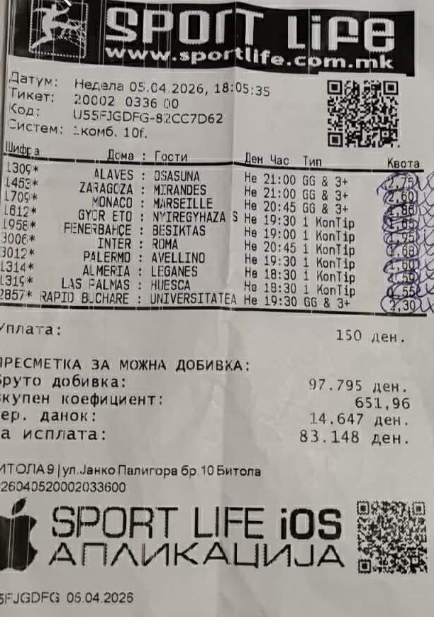 Третиот издвоен тикет е од Битола. Исто така десет натпревари, поголем дел од нив на конечен тип „кец“, а останатите со „гол-гол 3+“. За вложени 150 денари, добивка од од 1.400 евра. Воопшто не е наивно, напротив. Добивка за респект.
