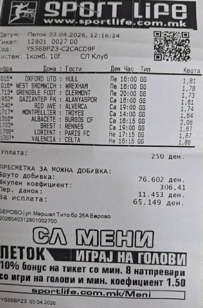 Следниот тикет е од Берово. Десет натпревари и идентична игра на сите, двете екипи да постигнат најмалку по еден гол. И добивката на крајот е повеќе од убава, 1.000 евра и кусур…
