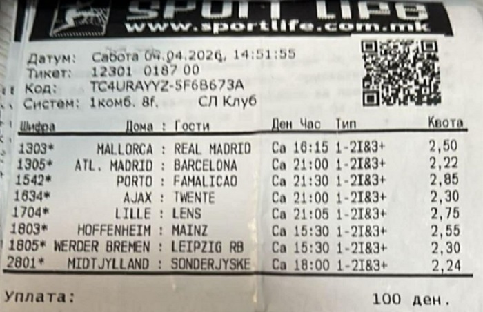 Третиот издвоен тикет е од Битола. Исто така десет натпревари, поголем дел од нив на конечен тип „кец“, а останатите со „гол-гол 3+“. За вложени 150 денари, добивка од од 1.400 евра. Воопшто не е наивно, напротив. Добивка за респект.