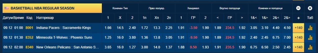 Минесота е голем фаворит на домашен терен против Феникс, а Сан Антонио спарс има големи шанси да излезе како победник на гостувањето во Њу Орлеанс. Ова е воочливо и според понудените квоти во Полноќниот експрес.