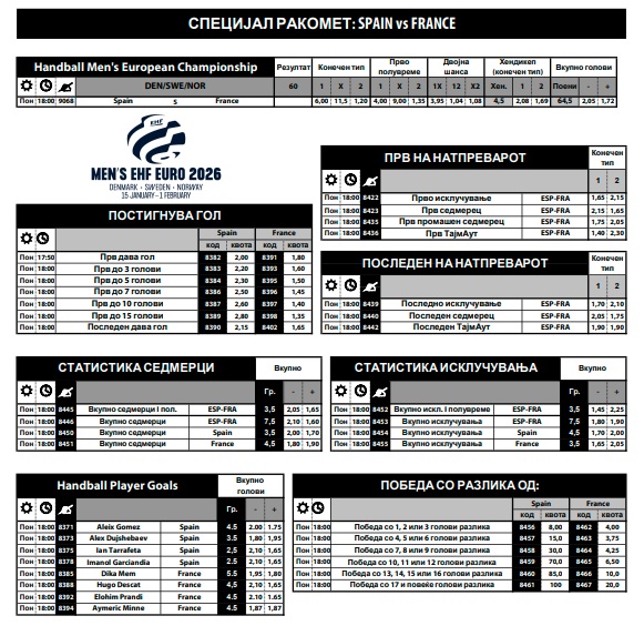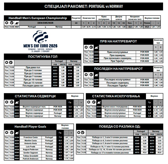 Можете да ги разгледате сите квоти за „милион игри“, прв дава гол, прво исклучување, прв седмерец, прв промашен седмерец, прв тајмаут, последно исклучување, последен седмерец, последен тајмаут, вкупно седмерци, вкупно исклучувања, итн…