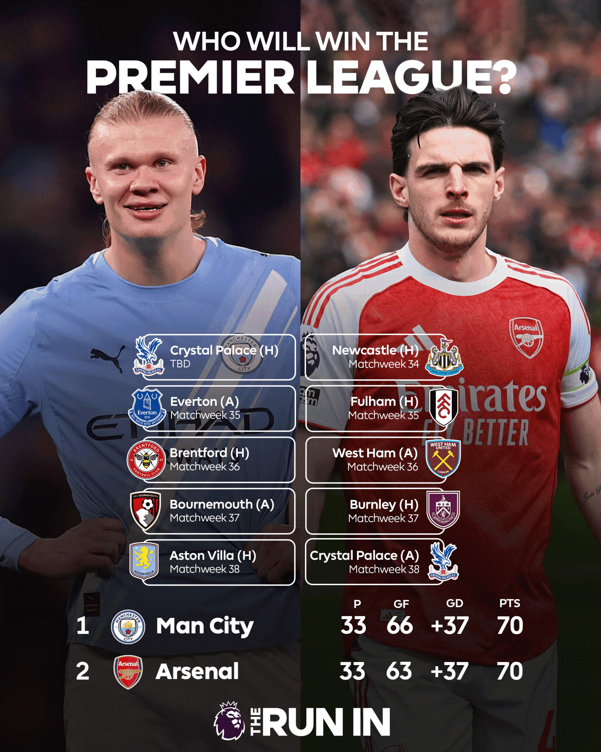 Ако и на крај после 38 кола имаат ист број бодови, тогаш ќе решава гол-разликата. Ако и во тој елемент се изедначени како во моментов, тимот што постигнал повеќе голови ќе биде првак. Во моментов, Сити има дадено три гола повеќе од Арсенал и би бил шампион. Ако имаат и ист број постигнати голови, шампион ќе биде подобриот во меѓусебните дуели, а тоа е екипата од Манчестер.