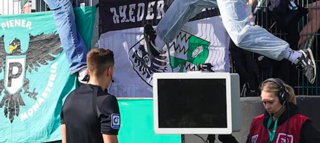 Cet après-midi, lors de la victoire du Hertha Berlin à Preußen Münster (2eme division allemande), deux individus masqués sont descendus de la tribune et ont debranché des câbles, empêchant l’arbitre de voir les images à l’écran.