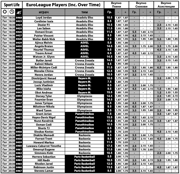 Во богатата понуда на Sport Life може да ги најдете и кошаркарите со најпопуларната игра меѓу типувачите – „плус-минус“ на поени, скокови и асистенции. Комплетната понуда може да ја најдете на следниов ЛИНК.
