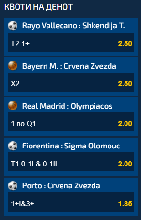 Пет интересни меча од кои три се фудбалски, а два кошаркарски се дел од денешната понуда во Квоти на ден. Доколку сите пет понудени комбинации ги одиграте на еден тикет, вкупниот коефицинет кој ќе го добиете е 46,35.