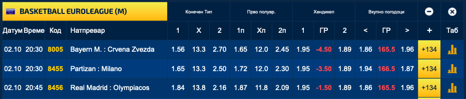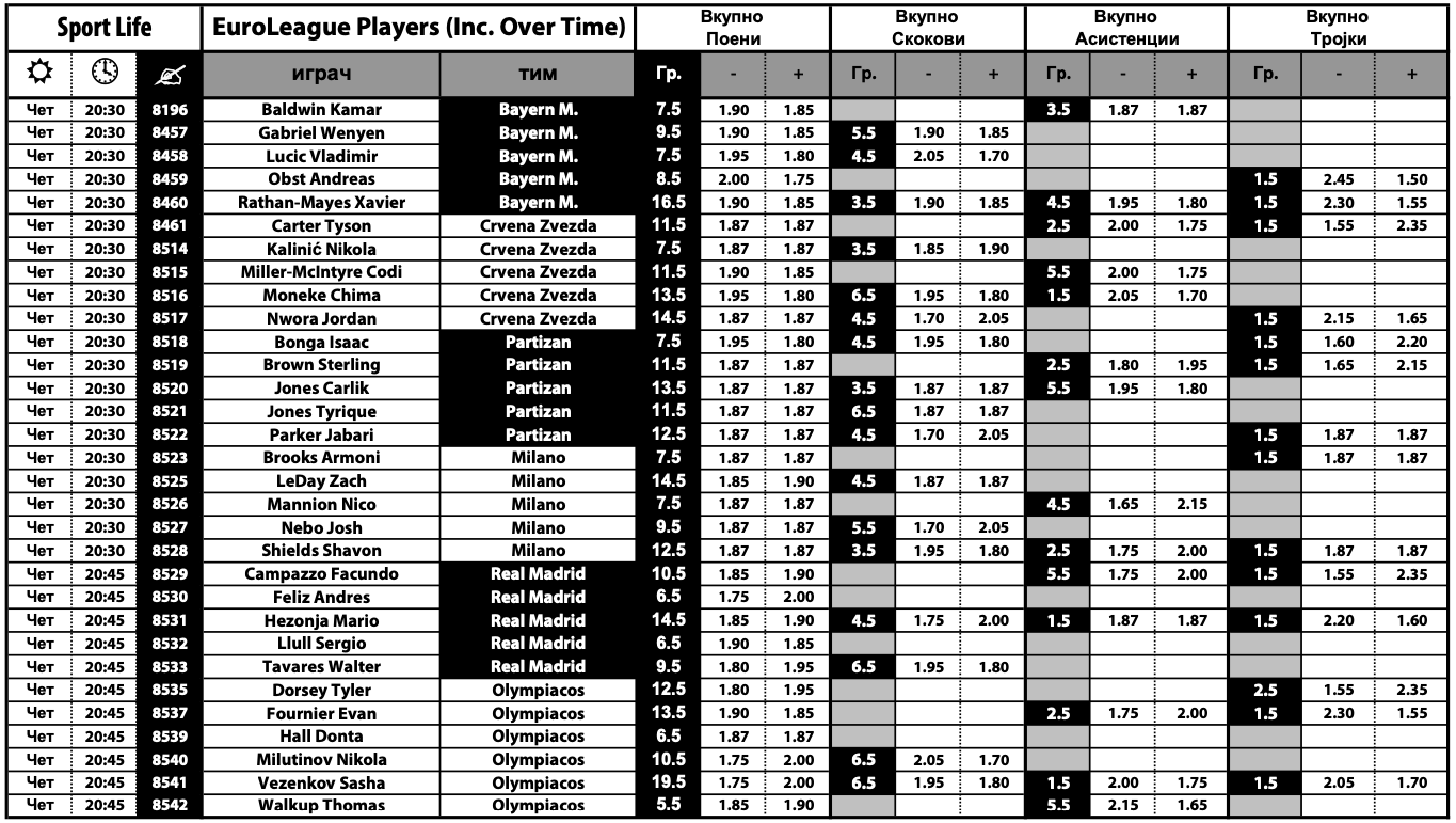 Кошаркарските возбудувања во Евролигата продолжуваат со три натпревари, кои на програмата се вечерва, а се дел од богатата понуда на Sport Life. Црвена ѕвезда по неочекуваниот пораз на домашен терен од Милано, вечерва му гостува на Баерн Минхен, а Германците ја имаат фаворитската улога според квотите во Sport Life.