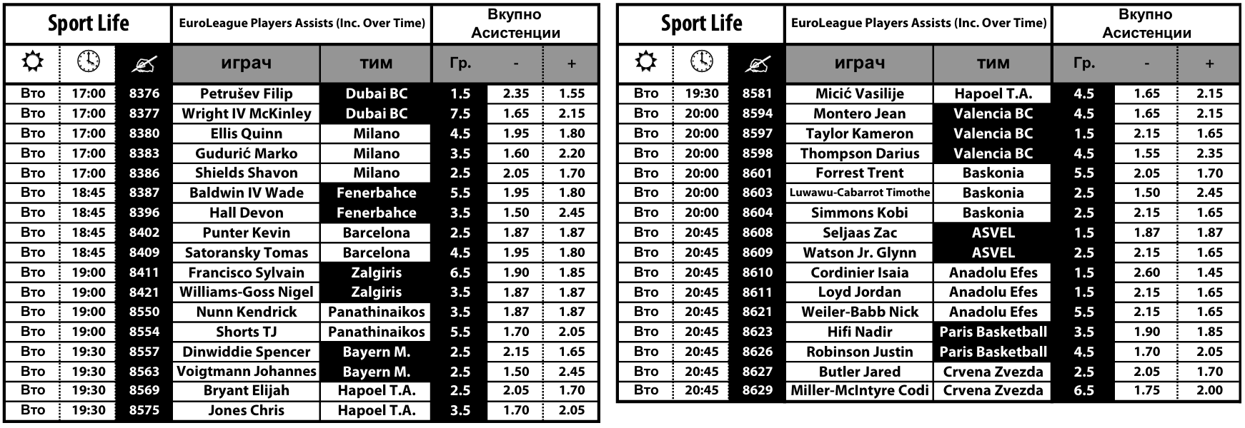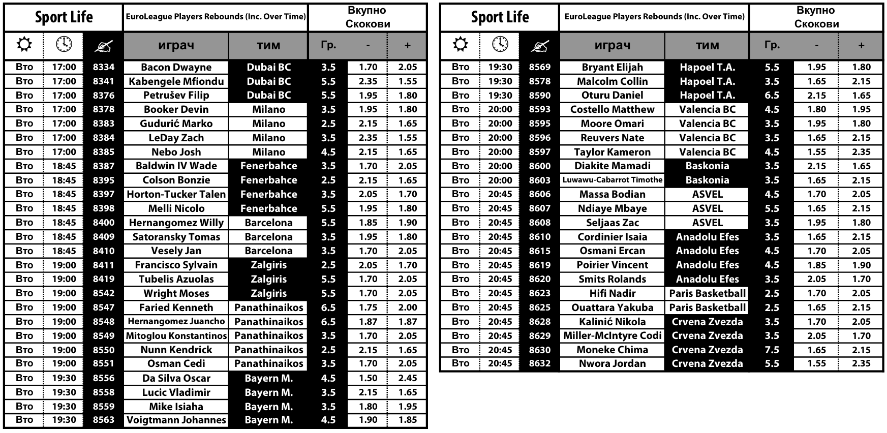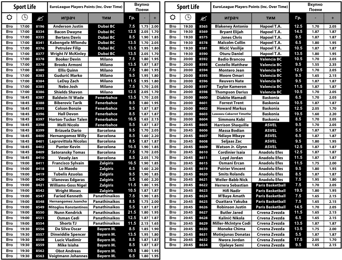 Вистински предизвик за типувачите ќе биде играта „плус-минус“ кај кошаркарите, која може да се одигра на поени, скокови и асистенции, а комплетната понуда за Евролигата во Sport Life може да ја најдете на следниов ЛИНК.