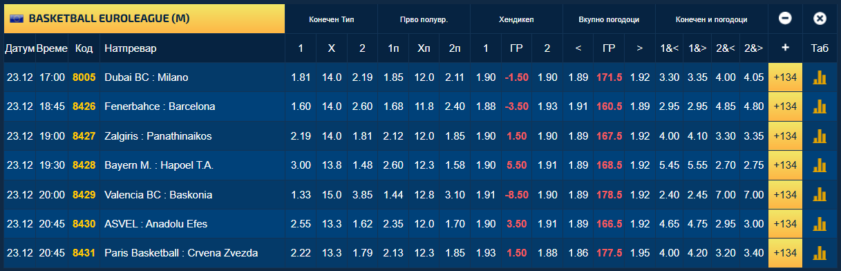Кошаркарите на Црвена ѕвезда како благи фаворити ќе се обидат да го освојат Париз, со квота за победа од 1.79 во понудата на Sport Life. „Блиски“ квоти има и за натпреварите Дубаи – Милано и Жалгирис – Панатинаикос.