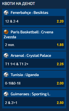 Пет атрактивни натпревари од кои четири се фудбалски, а еден е кошаркарски се дел од денешната понуда во Квотите на денот. Ако сите овие пет комбинации ги одиграте заедно на еден тикет, ќе добиете вкупен коефициент од 45,78.