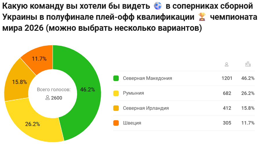 И Украинците сакаат да им се падне Македонија. Во една анкета на најпознатиот спортски портал во таа земја, на прашањето која селекција би сакале да ја видите за противник на Украина во полуфиналето од баражите, 46,2 отсто одговориле Македонија. Најмалку (11,7 отсто) се изјасниле за Шведска.