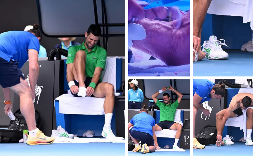 Physio working on Novak Djokovic right foot, blister on his toe area.