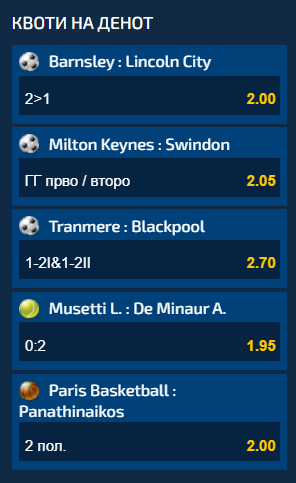 Квотите на денот најчесто се резервирани за фудбалските возбудувања, но овојпат во комбинацијата од пет средби има и понуда од кошарката и од тенисот. Доколку сите пет понудени комбинации се одиграат заедно на еден тикет, вкупниот коефициент кој ќе го добиете е 43.17.