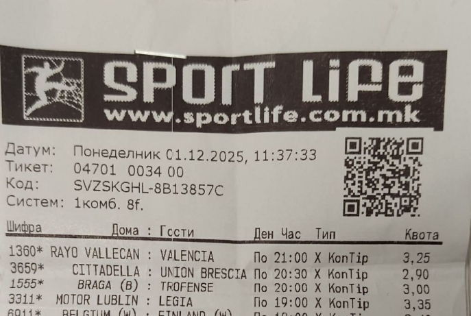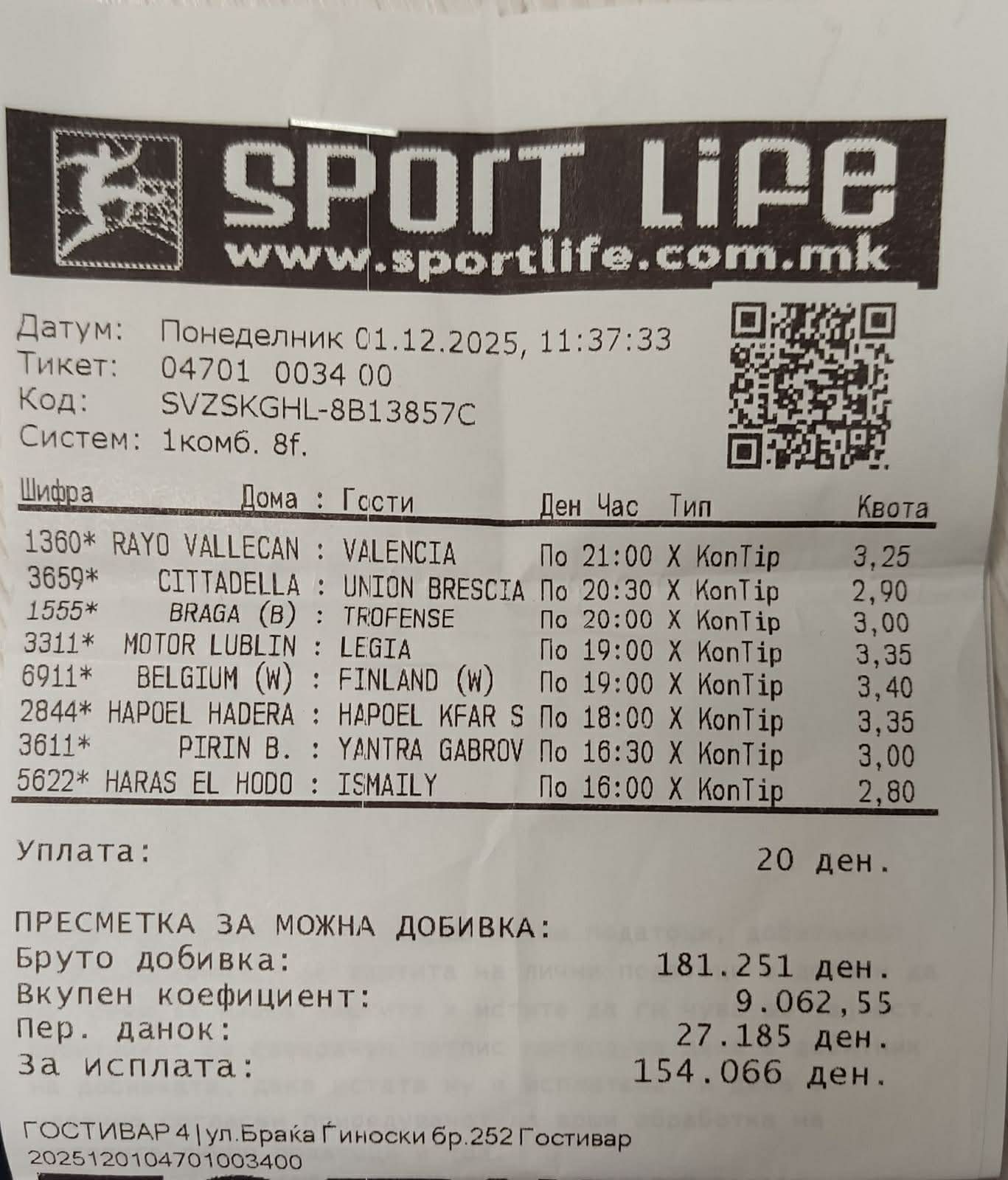 На крајот, нереалното ливче се претвори во добитно, па со само 20 вложени денари, добивката е 154.066 денари. Вкупниот погоден коефициент е неверојатен и изнесува 9.062.