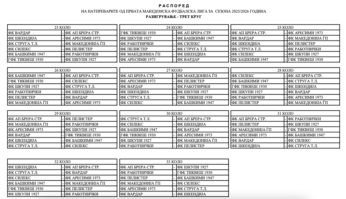 Вечното дерби помеѓу Пелистер и Вардар ќе се игра во 26-тото коло и тоа во Битола, додека лидерот на табелата најголемиот гостински предизвик ќе го има во претпоследното коло, кога ќе гостува кај Струга.