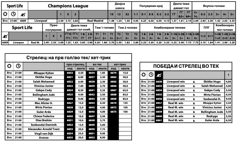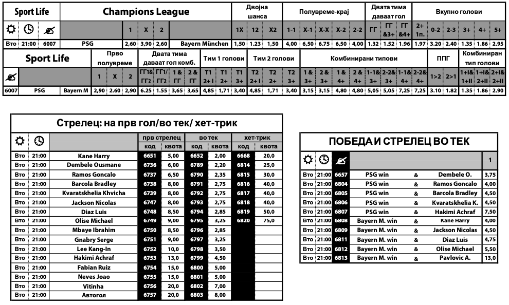 Интересно, квотите во Sport Life за ПСЖ и за Баерн Минхен се израмнети. Двете екипи имаат квота по 2.60 за победа, но таа квота може да се зголеми доколку ја комбинирате со стрелец на натпреварот. Може да одиграте и само на стрелец, но и на прв стрелец и хет-трик.