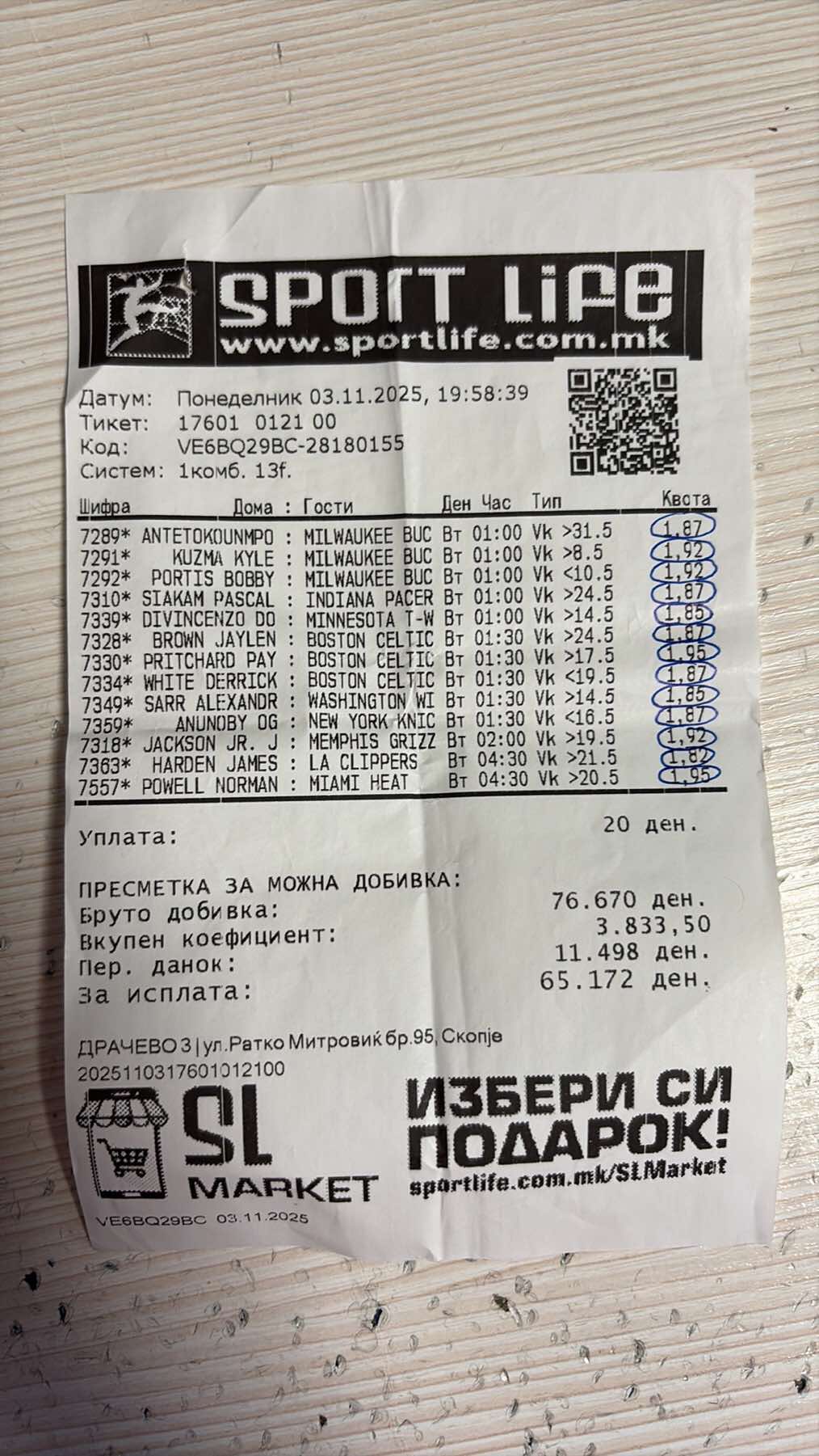 Во објект на Sport Life во Драчево, уплатен е овој супер тикет, а обложувачот се покажа како одличен познавач и кај сите 13-мина погодил дали ќе имаат плус или минус поени од зададената хендикеп граница.