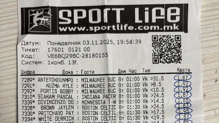 Во објект на Sport Life во Драчево, уплатен е овој супер тикет, а обложувачот се покажа како одличен познавач и кај сите 13-мина погодил дали ќе имаат плус или минус поени од зададената хендикеп граница.