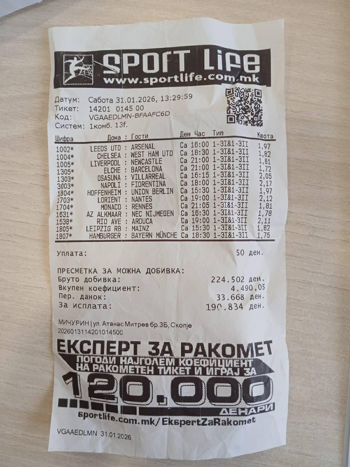 Одиграни се 13 меча на тикетот, кај сите е истата игра во кои се вклучени истите бројки 1 и 3 како кај 13-ката, и очигледно тоа се покажа како среќна и добитна комбинација. Точно се погодени исходите, секаде имаше од еден до три гола во двете полувремиња за заслужена добивка од над 3.000 евра.