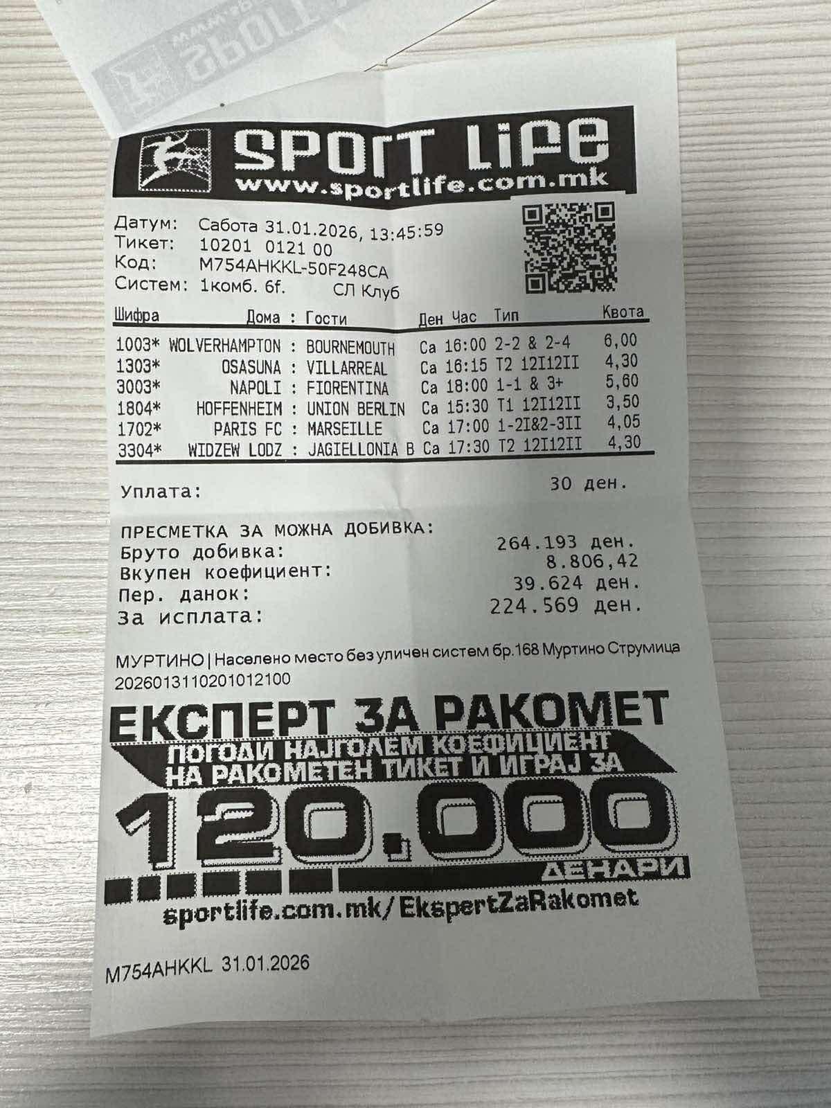 Во Sport Life во струмичко Муртино, во саботата е уплатен тикет со вкупна квота од дури 8.806, и тикетот е добитен. Уплатата од само 30 денари е претворена во супер бруто добивка од над 264 илјади денари.