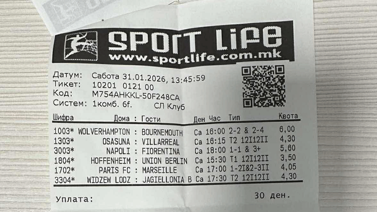 Во Sport Life во струмичко Муртино, во саботата е уплатен тикет со вкупна квота од дури 8.806, и тикетот е добитен. Уплатата од само 30 денари е претворена во супер бруто добивка од над 264 илјади денари.
