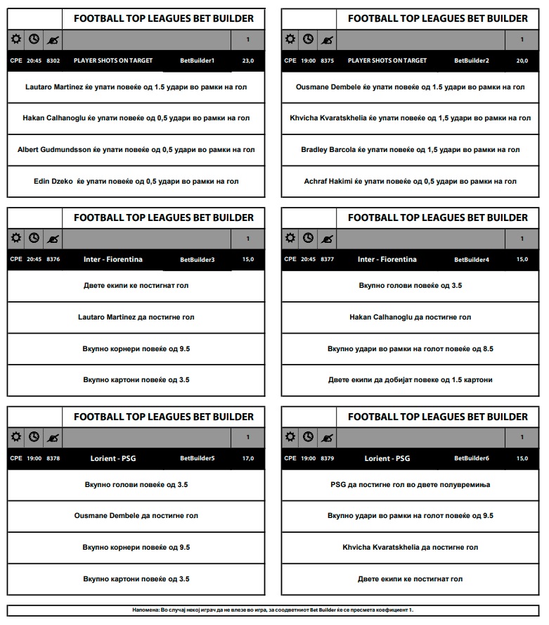 Доколку Лаутаро Мартинес упати најмалку два удари во рамки на гол, Хакан Чалханоглу барем еднаш погоди во рамки на гол, исто како и Алберт Гудмундсон и Един Џеко, се исполнуваат условите за Бет билдер опцијата со најголем коефициент, 23.