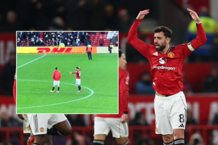 Камерите по мечот го снимија капитенот на Манчестер јунајтед, Бруно Фернандеш, како бурно реагира кон Мануел Угарте и Каземиро, очигледно разочаран од фактот дека не успеаја да дојдат до трите бода пред својата публика.