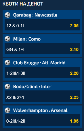 Возбудувањата во Лигата на шампионите продолжуваат, но има интересни мечеви и во Серија А и во Премиер лигата, па ако се искомбинираат сите пет предлози од Квотите на денот, вкупниот коефициент кој се добива е 39.42.